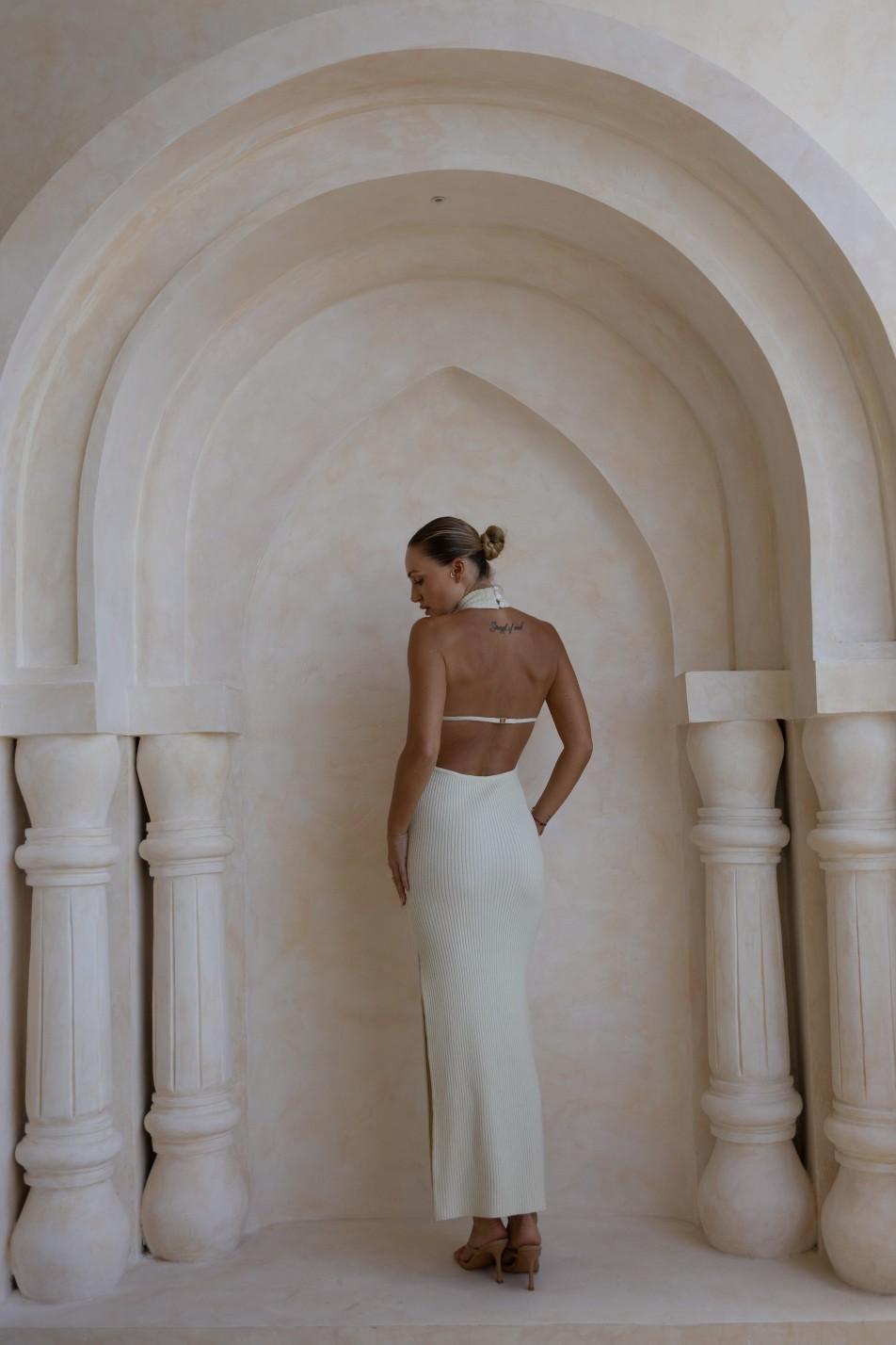 Długa, dopasowana sukienka z prążkowanej dzianiny w jasnym kremowym odcieniu. Zabudowany dekolt z odkrytymi plecami i regulowanym paskiem tworzy zmysłowy kontrast. Idealna na letnie wieczory, gdy chcesz połączyć elegancję z wygodą.